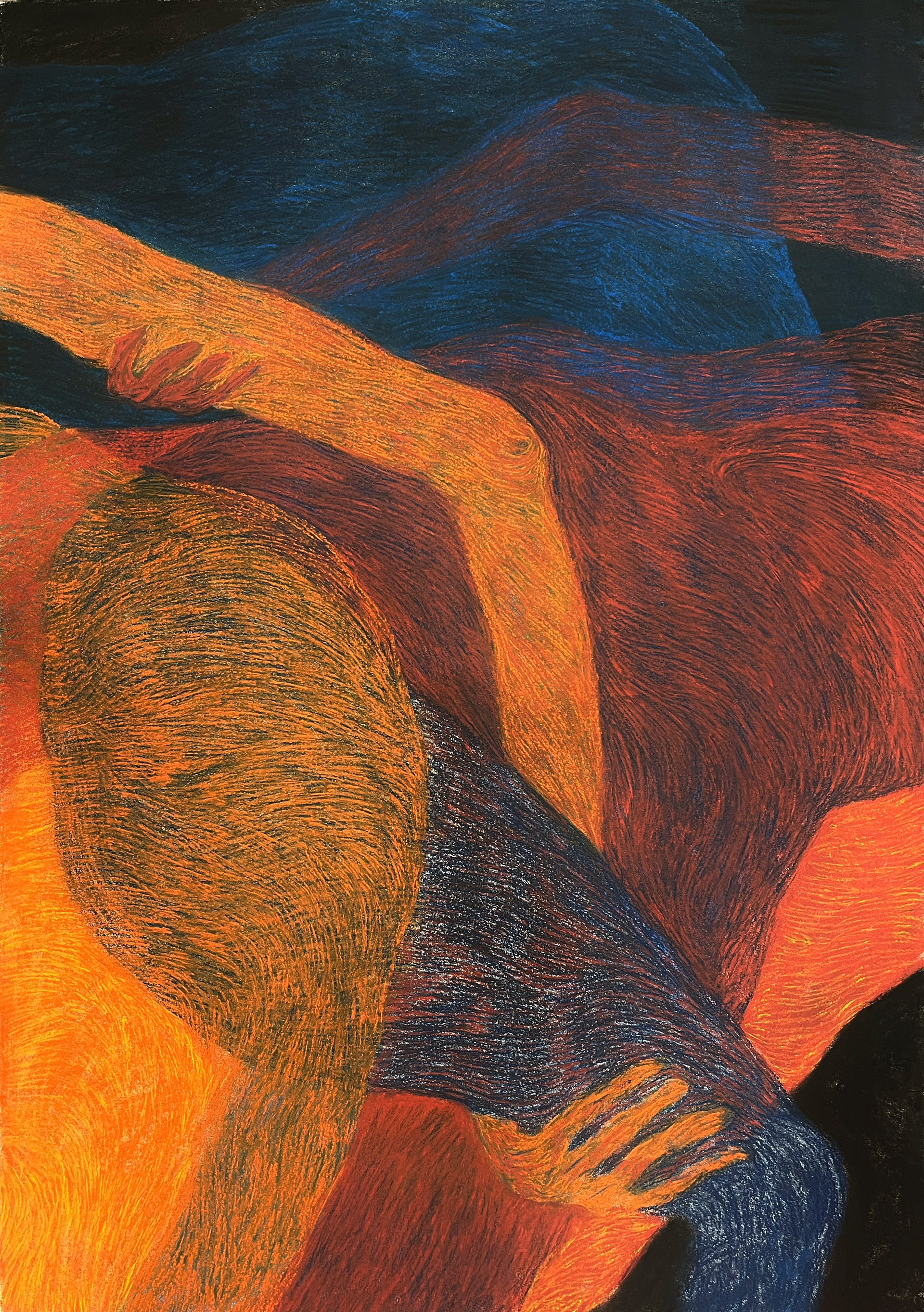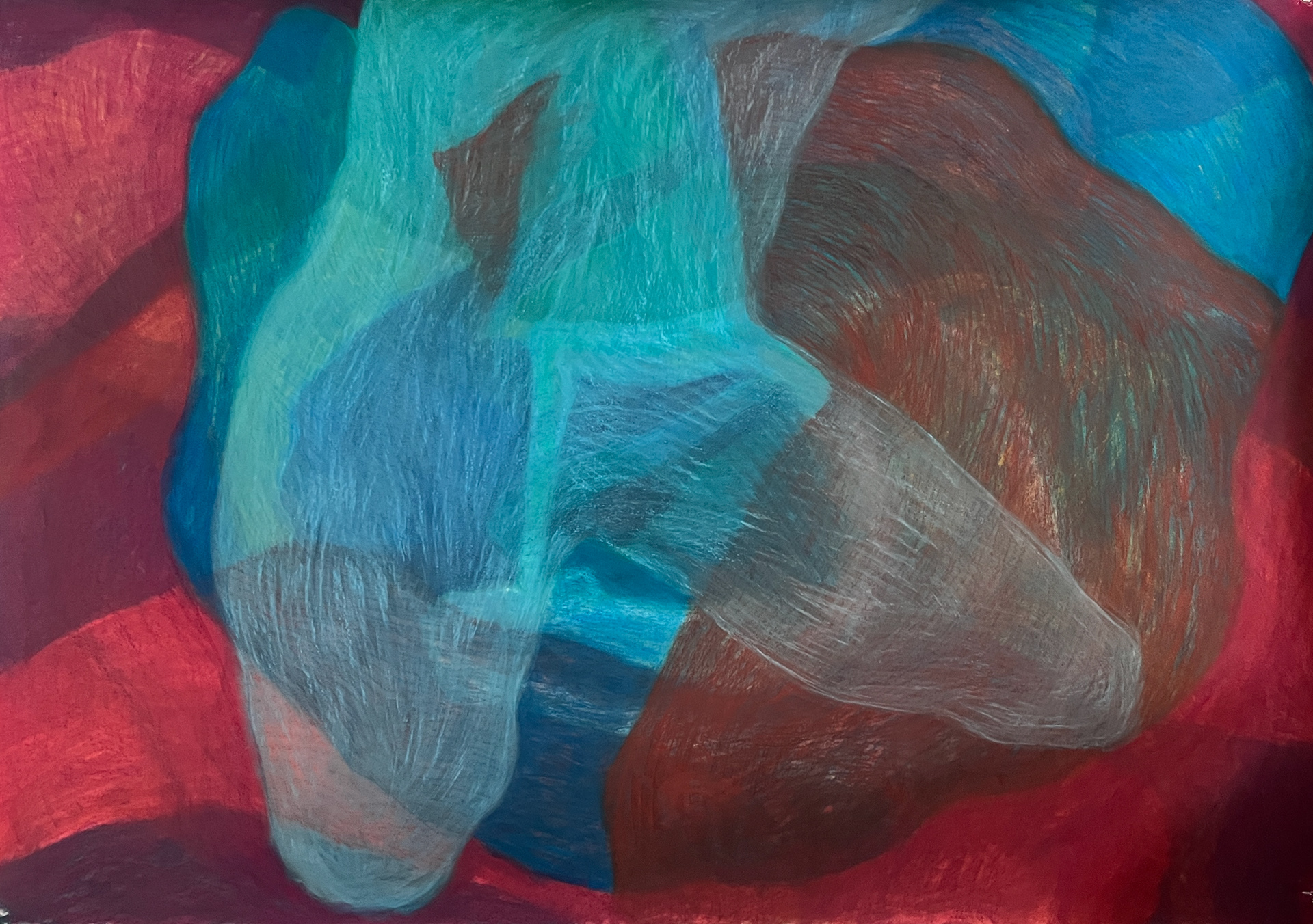 By removing facial features and gendered markers, the work shifts away from identity and toward weight, presence, and physical relation. The visible process of layering and erasure keeps the image open and unresolved.